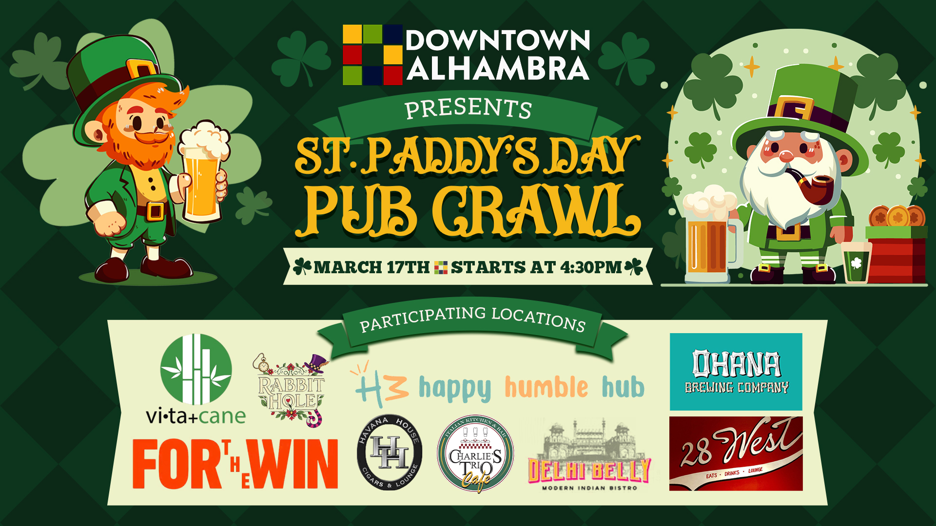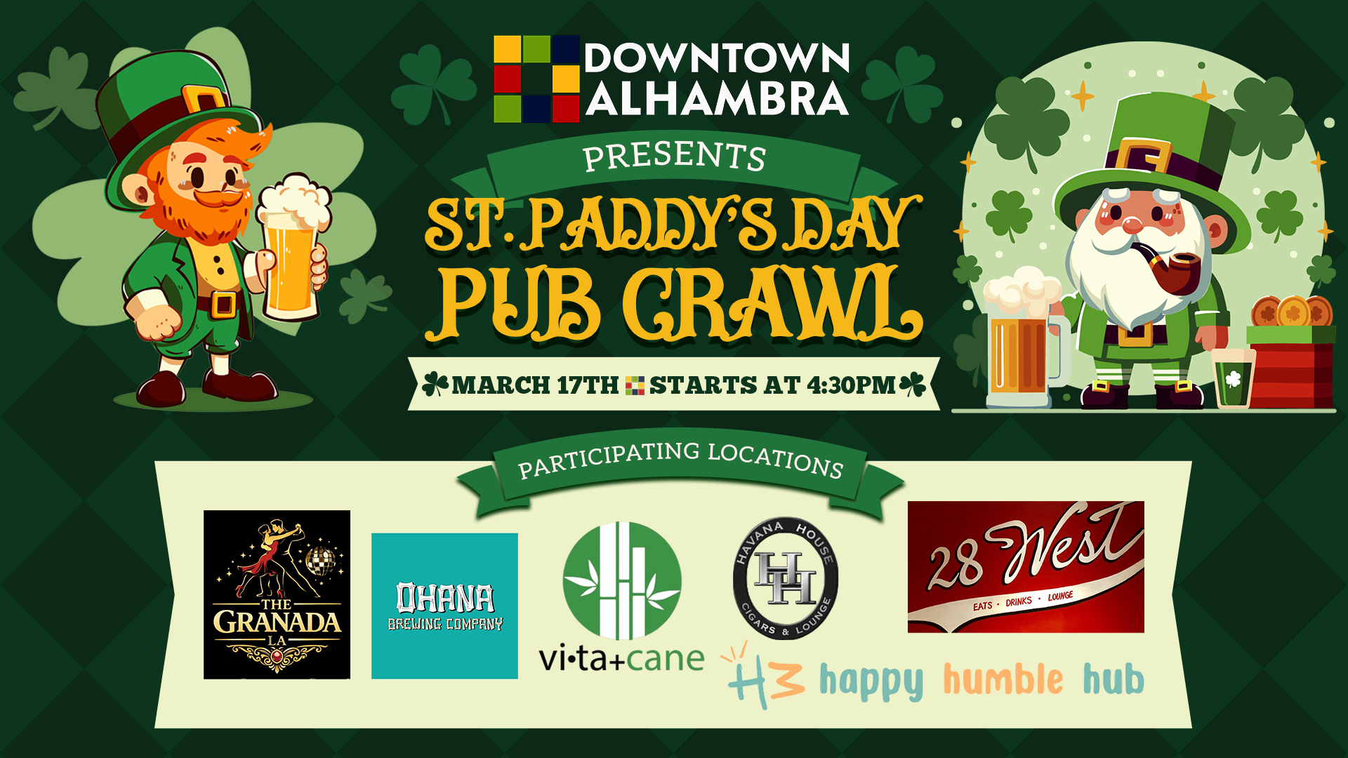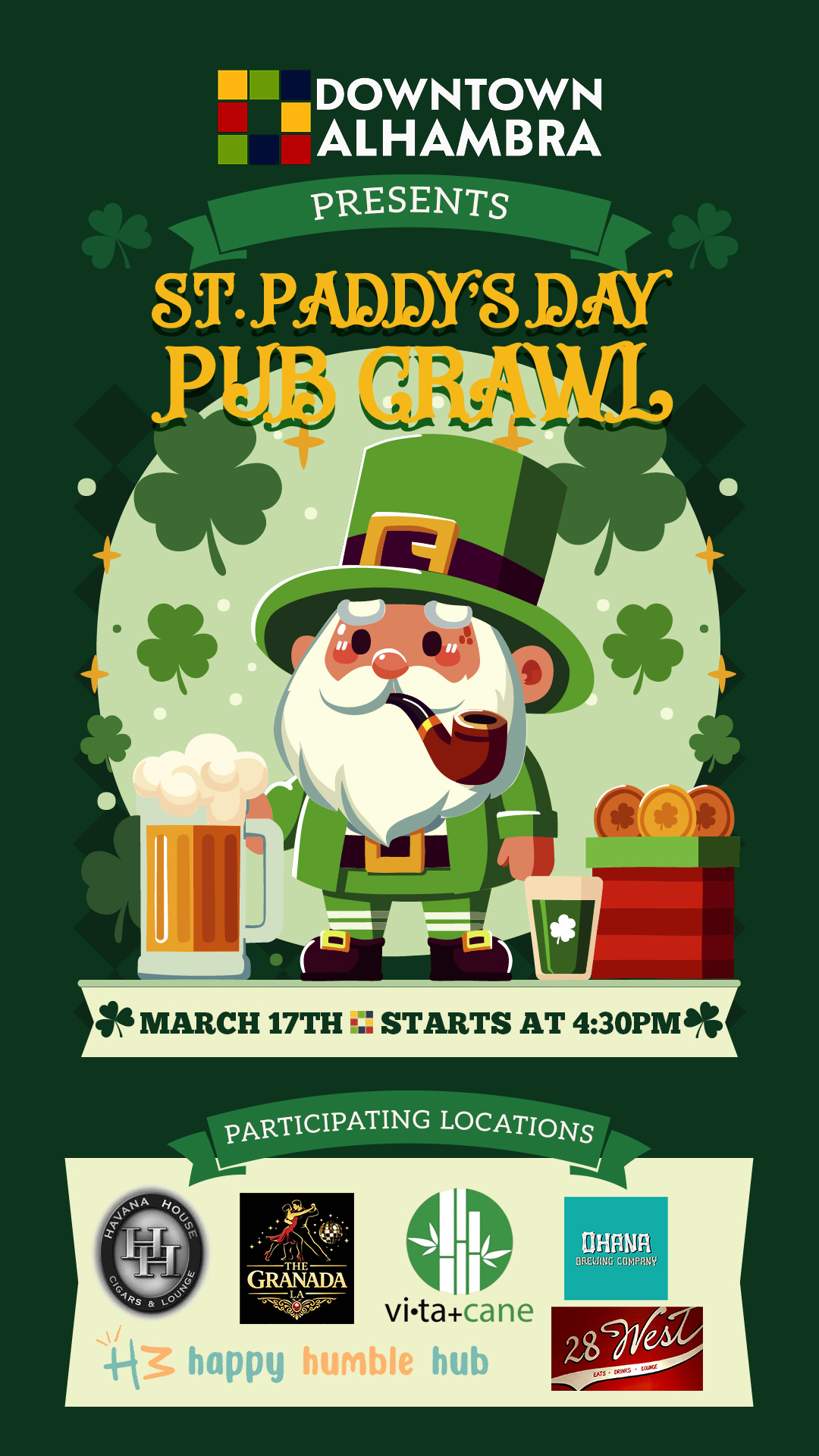 Get ready for a fun-filled night out in Alhambra! Join us for the St Paddy's Day Pub Crawl and enjoy great vibes, tasty drinks, and awesome company.